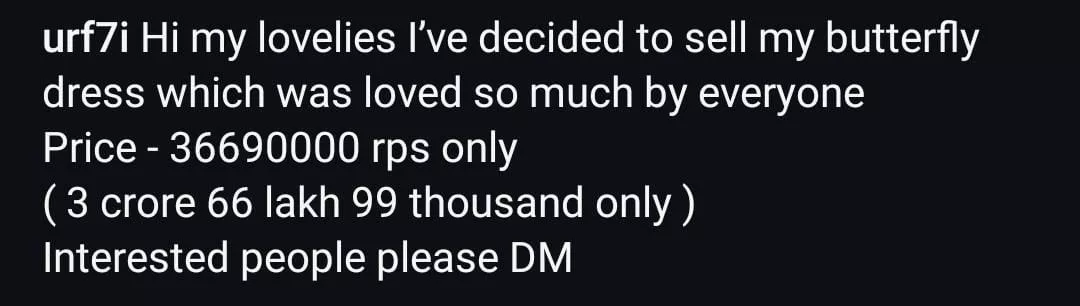 "Hi my lovelies I’ve decided to sell my butterfly dress which was loved so much by everyone. Price - 36690000 rps only ( 3 crore 66 lakh 99 thousand only ). Interested people please DM."