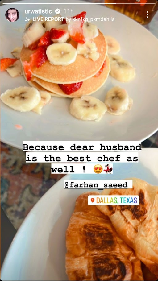 On November 2 2023, Urwa Hocane took to her Instagram and flaunted an elaborate breakfast cooked by her dear husband, Farhan, for her. In the picture, it can be seen that Farhan served Urwa a stack of pancakes topped with strawberries and bananas. Along with pancakes, he even served croissants for Urwa. Praising Farhan, Urwa wrote: