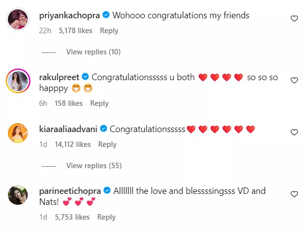 As soon as Varun dropped the good news on this Instagram account, celebrities started penning down their heartfelt congratulations for the two. Priyanka Chopra wrote, “Wohooo congratulations my friends.” The soon bride-to-be, Rakul Preet Singh said, “Congratulationsssss u both, so so so happpy.” Kareena Kapoor Khan congratulated the couple by saying, “Best feeling in the world.” And thousands of Varun Dhawan’s fans wished him the best in this new phase of his life.