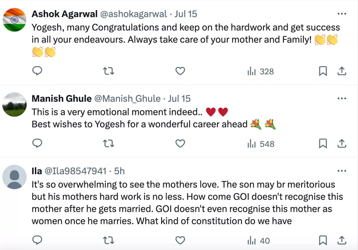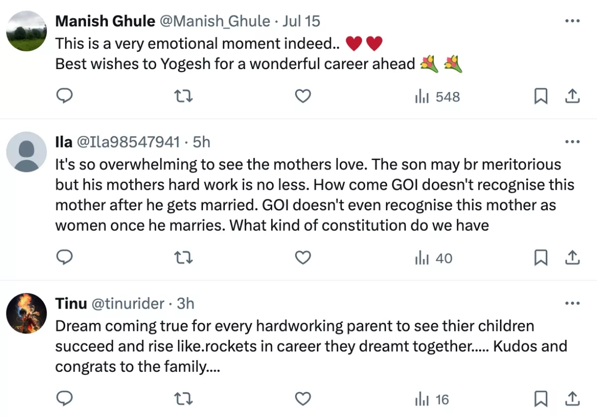 Another netizen pointed out the mother's struggle, and wrote, "It's so overwhelming to see the mothers love. The son may br meritorious but his mothers hard work is no less. How come GOI doesn't recognise this mother after he gets married. GOI doesn't even recognise this mother as women once he marries. What kind of constitution do we have."