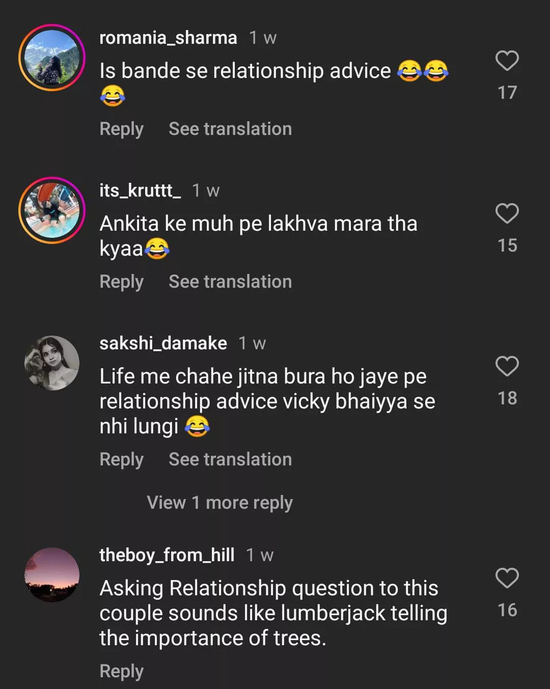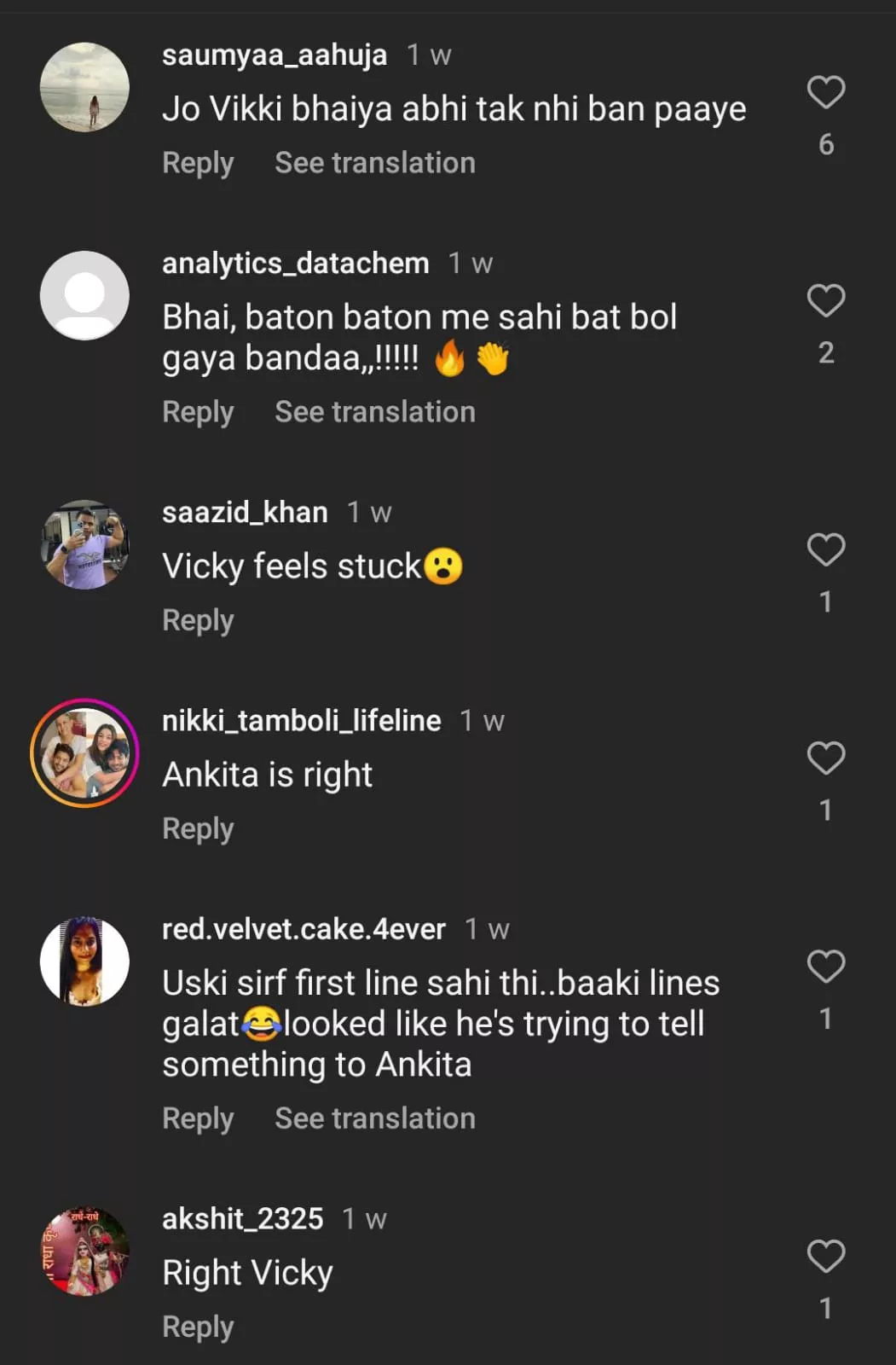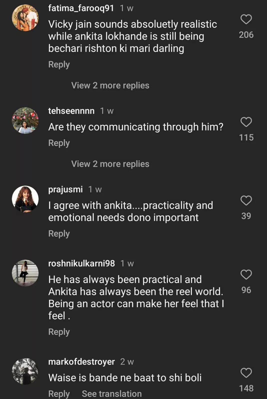 As soon as the video surfaced online, netizens rushed to the comment section to pen down their opinions. Reacting to the video, netizens started calling Vicky a bit 'realistic' as he served a witty response. On the other hand, some other users called Ankita's point of view is more from the 'reel world'. Some other users praised Vicky and stated that although Vicky may lack communication skills or empathy, he is more realistic. A few internet users even took a dig at Vicky's BB17 journey and mentioned that there's no point in taking relationship advice from him.