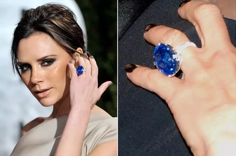 Another luxurious stone in Victoria's possession is the expensive sapphire. Her tenth engagement ring (spotted in 2010) consists of an oval-cut sapphire of titanic proportions, set on a thin pavé band. The bright blue 20-carat dazzling stone rivals the beauty of a night sky. Priced at around 5 million pounds, it is something a gemstone enthusiast would dream of adding to their collection.
