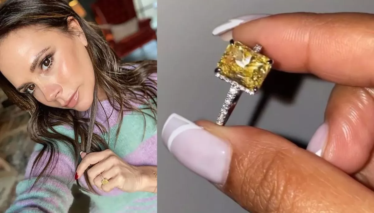 Completing the list of the 15 rings Victoria received from her husband, David Beckham, is the breathtaking square-cut yellow diamond set on a pavé band. It is her most recent engagement ring, which was first seen on her finger in 2018 and then in 2021 and 2022. This is the second yellow-coloured gemstone in Victoria's possession, and has cost David around 2 million pounds.