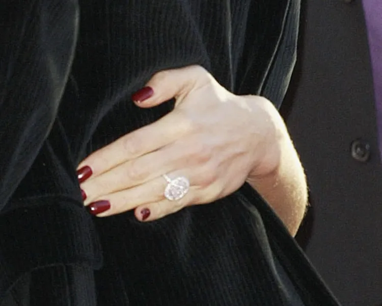 In 2004, David gave Victoria an oval-cut pink champagne diamond with a beautiful halo detail by Jacob & Co. It was a gift for her 30th birthday and was estimated to be around 2.5 million pounds at the time. The centre stone is about 7 carats, making it a rarity among pink-coloured diamonds. It is definitely one of the most envy-inducing stones owned by Victoria.