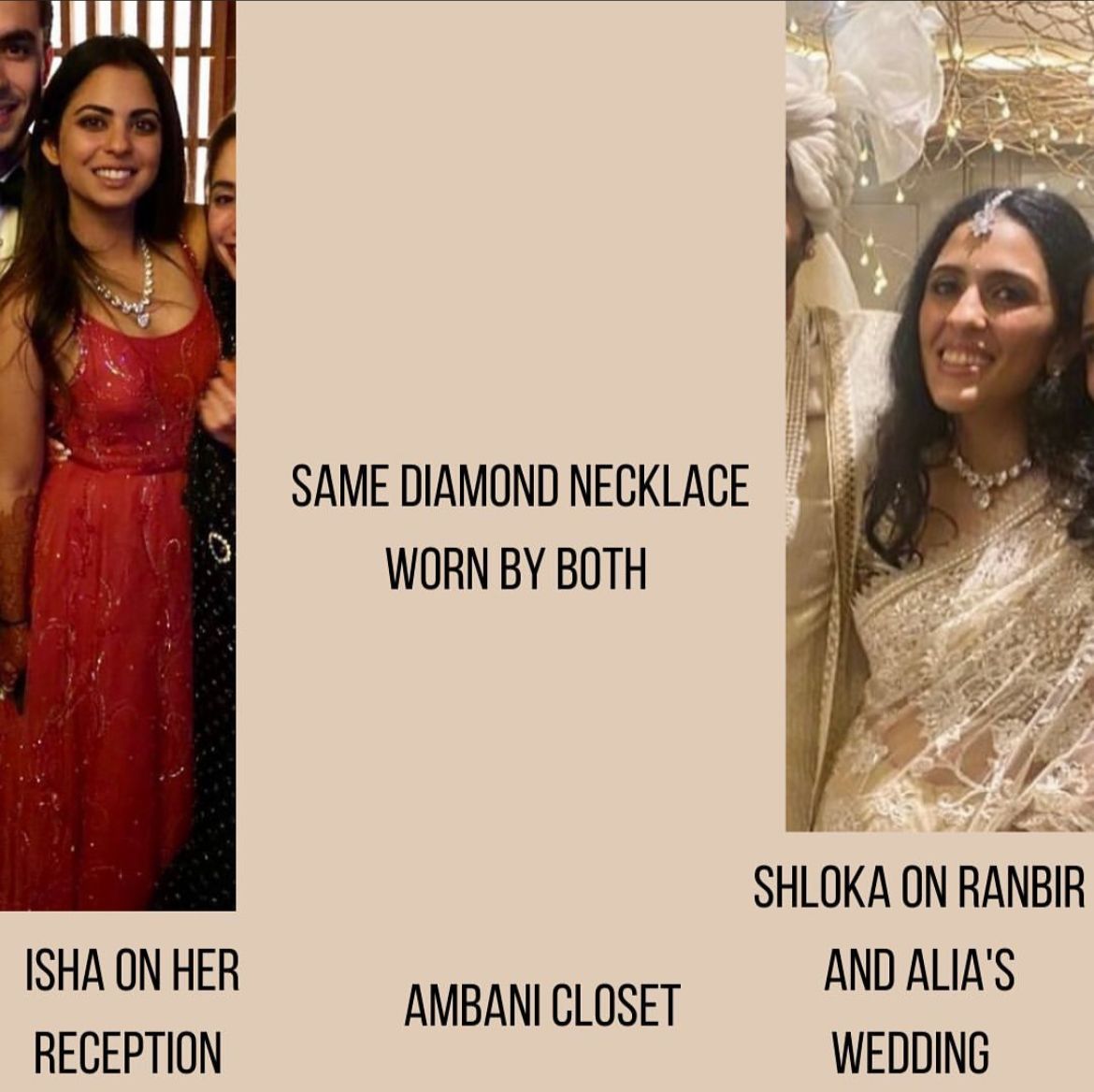 On October 29, 2018, the Ambanis had hosted a Ganesh Puja ahead of Isha Ambani's wedding with Anand Piramal. For the event, Isha had donned a heavily embroidered couture lehenga paired with diamond jewellery and had looked oh-so-gorgeous. And later, on March 9, 2019, when Radhika Merchant had attended Akash Ambani and Shloka Mehta’s wedding, she was spotted wearing Isha Ambani's necklace, which the latter had worn at the Puja. Check it out below: