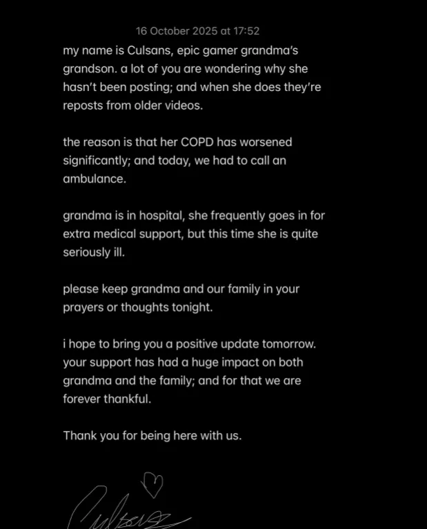Epic Gamer Grandma's grandson, Culan, after two months, revealed previously unheard details about his grandmother's health. He explained why his grandmother was not active on the social media. Culan reportedly, in an October 2025 post, shared that his grandmom's Chronic Obstructive Pulmonary Disease had worsened significantly, and the family had to call for an ambulance. Culan then shared an update that his grandmother had 'suffered a major stroke' and was also undergoing heavy treatment.
